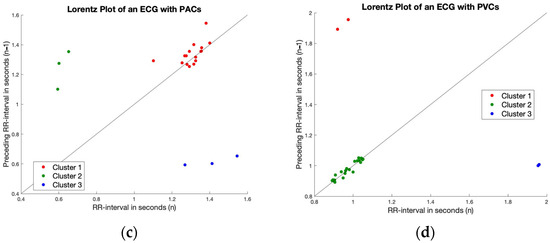 The K-means clustering function in four different ECGs; (a) is a healthy ECG without any irregularity and clusters, there are also no clusters found; (b) is an ECG with AF with irregularity, but no clusters, which are also not found by the function; (c) is an ECG with PACs, so with irregularity and clusters are found; and (d) is an ECG with PVCs, so also with irregularity and clusters are found.