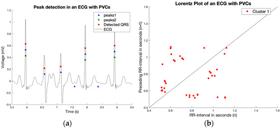 The ECG and found peaks by the algorithm (a) of a patient with PVCs, where the clusters were not identified through the algorithm (b).