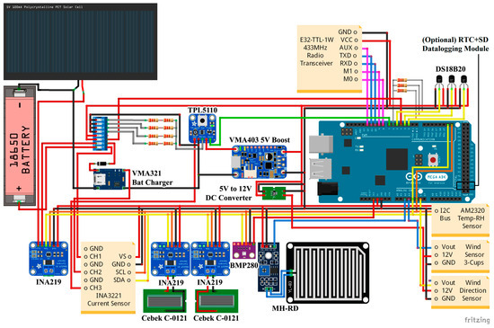 In its most complete version, the transmitter can include up to five temperature sensors (four air temperature sensors and one 9 cm black globe temperature sensor), a relative humidity sensor, a barometric pressure sensor, two solar irradiance sensors (one facing upwards and another facing downwards), a wind speed and wind direction sensor, a raindrops sensor, and various voltage and current sensors to ensure the correct operation of the device. A list of available sensors and characteristics is shown in Table 1, and the electronics schematic is shown in Figure 2.