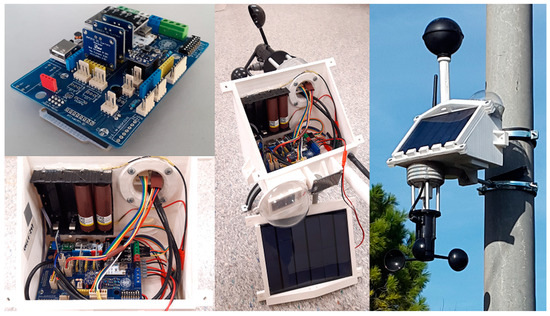 The device has been assembled into a rainproof custom PLA plastic 3D-printed box. This box has been designed to accommodate all the external sensors: the anemometer, the black globe, two irradiation sensors and the raindrops sensor, as well as the radio antenna and the solar panel in an optimal tilt angle of 48°. A methacrylate semi-sphere protects the upper irradiation sensor to avoid sensor degradation and minimize dirt accumulation. It also includes a small solar radiation shield for the temperature and humidity sensors. The DS18B20 sensors allow for two configurations to measure air temperature embedded into the device and measure air or surface temperature through an up to 100 m cable.