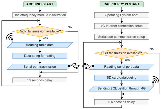 Several parts form the receiver (Figure 5). First, an Arduino UNO microcontroller connected to another 433 MHz radio frequency module receives the data sent by every transmitter. Then, following the flow diagram in Figure 6, it sends this data via serial communication through a USB cable to a Raspberry Pi 3 board. This board works on a Debian-based operating system, which runs several Python and Linux command scripts that manage the internet connection through a 4G USB Modem and upload the data to a SQL database hosted in the cloud. Data is also saved on a microSD card for a local backup. Each radio module is configured with a unique ID that identifies the receiver. This way, every transmitter sends data to just one receiver, allowing for unlimited transmitters to send data to up to 256 receivers in the same area thus avoiding duplicate measures.