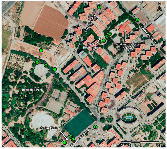 The system was tested in Valencia (Spain). Twelve transmitters and a receiver were installed in various locations within the Benicalap-Ciutat Fallera district. They were left to operate for more than one year, and the data was collected for analysis. The devices’ locations are shown in Table 3 and Figure 7.