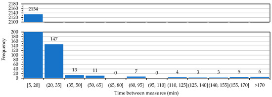Analyzing a month of data registered in the database, given that measures should be taken every 15 min, we can determine how many radio transmissions failed. Due to the slow dynamics of the studied parameters, such as temperature, it is not critical to lose some inputs. For that, we calculated in which time intervals the measures were taken to determine when a significant amount of data was lost. As an example, a histogram of elapsed time between successful measures for HSM1 is shown in Figure 8.