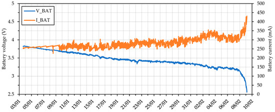 A second test was carried out to verify the device’s performance and energy consumption. It used data from a device installed in its final location under actual operating conditions, taking measures every 15 min with its PV panel disconnected. The test results revealed that using all the sensors, the device could operate autonomously for up to 36 days using four batteries without recharging (Figure 9).