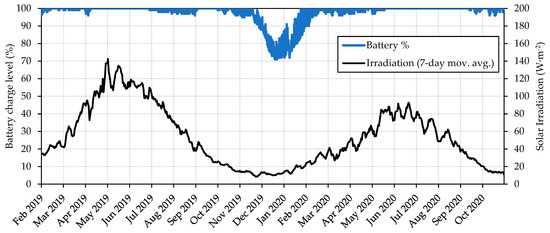 Battery state of charge and solar irradiation (7-day moving average). Data collected from HSM1 with PV panel in real operating conditions from February 2019 to November 2020.