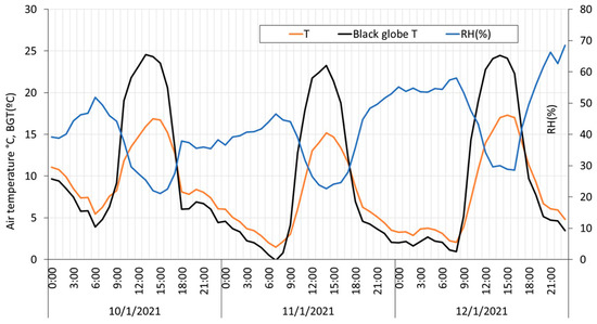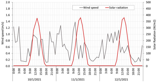 Data extracted directly from the database allows us to plot the main parameters under study. Figure 11 shows air temperature, black globe temperature, and relative humidity data, and Figure 12 shows wind speed and solar radiation data collected from HSM1 from 10 January to 12 January of 2021.