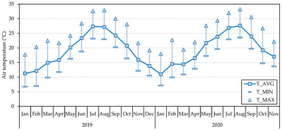 We can also plot the annual temperature variations by gathering data from various months. Figure 13 shows the monthly maximum, minimum, and average air temperature calculated from the daily averages from HSM3 from January 2020 to November 2021.