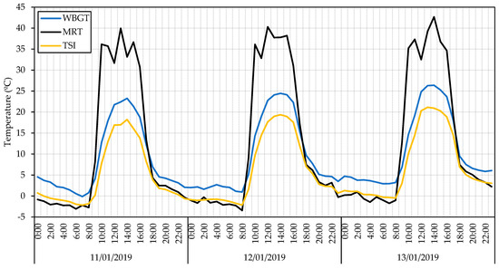 Using the data collected by the HSM system, we can estimate the heat stress indices described in the Methodology (see Section 2.1). Figure 14 shows the results of calculating the WBGT, MRT, and TSI index for HSM1 from 10 January to 12 January 2019.