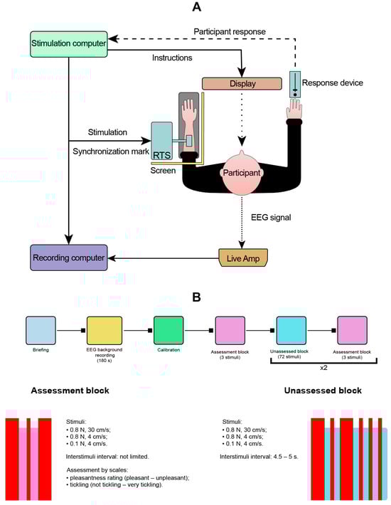 The stimulation included 153 tactile stimuli of three types further referred as fast (brush made of synthetic squirrel fur, N, cm/s), slow (brush made of synthetic squirrel fur, N, cm/s), and ultralight (brush made of synthetic peacock feather, N, cm/s). The stimulation included three blocks for subjective assessment, where after each of the stimuli, the participants were prompted to rate their subjective ticklishness and pleasure with VAS, resulting in 9 assessed stimuli. A total of 144 stimuli were presented without any feedback in a pseudorandom sequence with a random interstimulus interval of 4.5–5.5 s to prevent the time-locking of EEG rhythms. Assessment blocks were in the beginning, in the end, and in the middle of the sequence (See Figure 1B for an experiment timeline).
