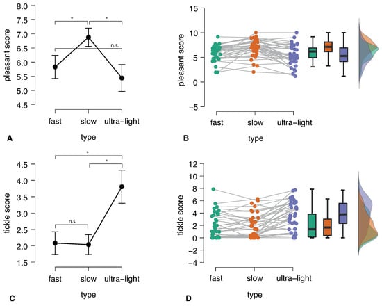 Difference in the pleasant score across conditions: (A) group mean and 95%CI, and (B) individual trends. Difference in the tickle score across conditions: (C) group mean and 95%CI, and (D) individual trends. * , “n.s.” means not significant. Illustration is generated in JASP (version 0.16.2), an open-source statistics program [].