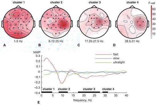 Difference in the NWP across conditions is shown via four clusters (panels (A–D)). Each panel shows the F-value distribution across sensors and the NWP spectra for three conditions. Panel (E) shows the NWP spectra for fast, slow, and ultralight stimuli together with the localization of all clusters.