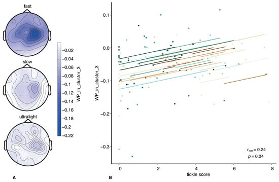 The results of the correlation analysis between the subjective rating (tickle score) and brain activity (NWP in the third cluster). Panel A displays the spatial distribution of NWP across the electrodes in the frequency range corresponding to the second cluster. (data are averaged across all subjects) In Panel B, the colored dots represent data from each participant, while the lines illustrate the slopes estimated for these participants through the repeated measures correlation analysis. Different colors show data of different participants.
