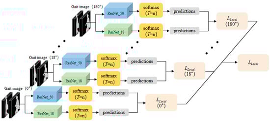 In order to effectively extract the gait features of each single viewing angle, MJKD uses multiple teacher models and student models to train the images of each single viewing angle respectively. Through continuous iterative training, the probability distribution of the output of the teacher model at the distillation temperature  is as similar as possible to that of the student model at the distillation temperature. As shown in Figure 3, in the local knowledge distillation, the cross-view gait image is divided into 11 single-view gait data points according to the angle. Each set of single-view gait data is trained by a teacher model and a student model, and the predicted results obtained from the training are performed by loss calculation. Finally, the weights of the 11 local losses are averaged and summed to obtain . Because there is no overlap of features in the same view angle, the gait features extracted from the same view angle are more abundant. Local loss  is shown in Formula (3).
