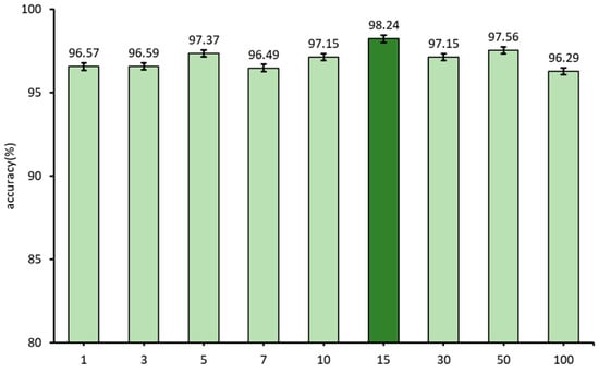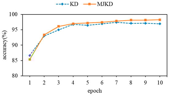 The MJKD algorithm leverages the softening output of the softmax layer to guide student model training. The distillation temperature  is a crucial factor that can either amplify or diminish the positive and negative labels in the softening output. As the value of  becomes larger, the probability distribution of the output of the softmax layer tends to be smoother, the entropy of the distribution is larger, the positive labels of the correct category are relatively reduced, the negative labels of the incorrect categories are relatively amplified, the learnable information carried will be relatively amplified, and the model training will pay extra attention to the negative labels. When the value of  becomes smaller, the difference in probability distribution output by the softmax layer becomes larger, the entropy of its distribution is smaller, the information carried by the negative label of the incorrect class will be relatively compressed, and the model training will mainly focus on the positive label. Figure 9 shows the recognition accuracy results at different distillation temperatures, and it can be seen that the distillation temperature has little influence on the recognition accuracy. In this experiment, the best identification accuracy was achieved when the distillation temperature  was 15.