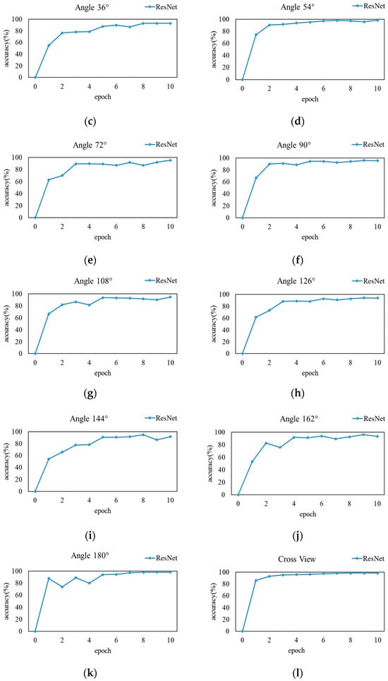 Training results of the network model under different views. ((a–k) are line charts of the recognition accuracy of a single teacher module after training on the 0° to 180° view datasets, respectively. (l) is line chart of the recognition accuracy of a single teacher module after training on the cross-view dataset).