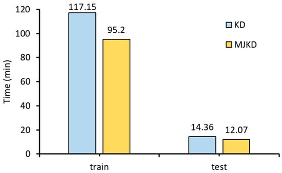 Training and test duration are important indicators for measuring the performance of a model. In this study, we aim to evaluate the performance of ResNet trained using MJKD. Both MJKD and KD methods were employed to train and verify ResNet, and the results are presented in Figure 7. The analysis reveals that the training time for ResNet_18 trained with KD is 117.15 min, whereas with MJKD it is reduced to 95.2 min, resulting in a 1.23 times reduction in duration. The ResNet_18 trained with KD took 14.36 min, while the one trained using MJKD had a test duration of 12.07 min, which is 1.19 times shorter. From the above data, it is evident that ResNet_18 trained using MJKD exhibits faster reasoning speed and reduced time costs during both the training and testing phases.