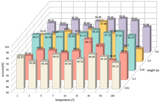 Building upon the insights gleaned from Section 4.7.2 and Section 4.7.3, a comprehensive joint analysis is undertaken to assess the combined influence of variables  and  on recognition accuracy. In Section 4.7.2, notable fluctuations in recognition accuracy are observed when  attains either extreme, with optimal results achieved when weight parameter  is 0.45. In Section 4.7.2, the recognition accuracy results at different distillation temperatures  are shown, and it can be seen that the distillation temperature  has little influence on the recognition accuracy. In this experiment, the best identification accuracy was achieved when the distillation temperature  was 15. Figure 10 shows the recognition accuracy results for different temperatures  and different weights . The recognition accuracy is low when the weight  and temperature  are extremely high or extremely low, and the best results are achieved when  is 0.45 and the distillation temperature  is 15. The empirical findings in this section exhibit concordance with those elucidated in Section 4.7.2 and Section 4.7.3. Additionally, the experiments undertaken in this specific section serve to reinforce and substantiate the rationale behind the experiments delineated in Section 4.7.2 and Section 4.7.3. This iterative validation contributes to the robustness and reliability of the experimental methodology employed across the entire investigation.