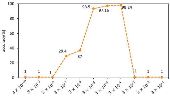 The influence of different learning rates on recognition accuracy is illustrated in Figure 11. The graph indicates that, initially, as the learning rate increases, the recognition accuracy improves. However, beyond a certain point, a further increase in the learning rate leads to a decline in accuracy. When the learning rate is too small, the model fitting speed becomes slow, resulting in low recognition accuracy after 10 epochs of iterative training. On the other hand, when the learning rate is too large, the model fails to converge. In this experiment, the highest recognition accuracy was achieved when the learning rate was set to 3 × 10−4.