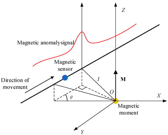In the magnetic anomaly detection model (Figure 1), a magnetic target with the moment of M is located at the origin O of a Cartesian coordinate system, with M lying along the negative direction of the Z-axis. A sensor moves along a straight line with a relative angle θ between the search path and the positive X-axis, l is the closest contact distance between the detection path and the magnetic target, and v represents the sensor moving speed. The total magnetic field consists of the background magnetic field and the anomalous field generated by the ferromagnetic object, namely