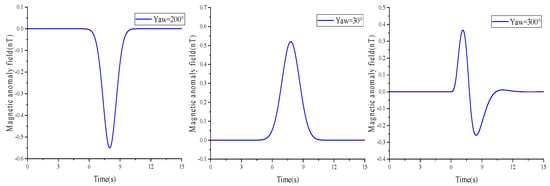 The equivalent magnetic moment is set to M = (0, 0, 0.3)A∙m2, the magnetic sensor moves along the θ = 30°, 200°, and 300° directions, the speed is set to v = 5 m/s, the closest contact distance between the detection path and the magnetic target is l = 5 m, and the sampling frequency is 2 kHz. Combining Equations (1) and (2) and the simulation conditions, the simulation obtains three typical magnetic anomaly signals, as shown in Figure 2.