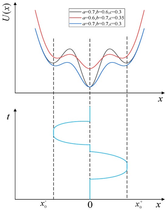The MBSR model controls the potential wells at both ends, and the potential well in the middle is controlled by the GP model, achieving independent regulation of the potential wells. As a decreases from 0.8 to 0.6, the width of the potential wells remains the same, the depth of the intermediate potential well gradually decreases, and the particle consumes less energy to jump to the potential well. As b increases from 0.4 to 0.7, the depth of the middle potential well remains constant and the steepness of the potential wells on both sides gradually flattens out, facilitating the particle leap. From Figure 3, it can be seen that the locations of the minima are x = 0, x = x0−, and x = x0+ (where x0− and x0+ are obtained from Equation (5)), and two potential barriers (maxima) separate the three minima zones.