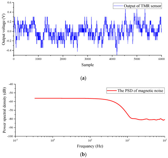 In an open area devoid of magnetic interference, as illustrated in Figure 8, such as public frequency noise, the test system was employed to measure the geomagnetic field. The obtained real geomagnetic noise comprises the actual geomagnetic field along with the intrinsic noise of the TMR sensor and the noise parameters of the amplifier circuit. The true geomagnetic noise and its corresponding power spectral density (PSD) are depicted in Figure 9.