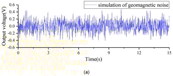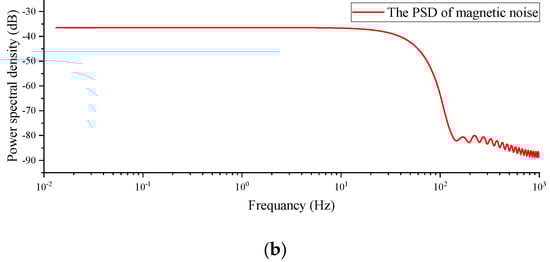 Based on the inherent characteristics of natural geomagnetic noise, we designed a simulated geomagnetic noise signal that closely resembles the power spectral density of the real geomagnetic noise. The simulated geomagnetic noise and its corresponding power spectral density are presented in Figure 10.