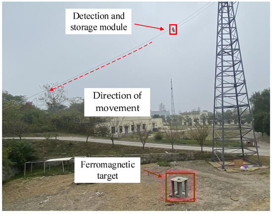 Field testing was performed according to the magnetic anomaly detection model in Figure 1, and the test method is shown in Figure 11. The detection and storage module glides from the top of the tower (height of about 15 m) to the ground at a constant speed (4–5 m/s) by motor control. The ferromagnetic target is placed on the ground below the direction of movement. Three different typical magnetic anomaly signals are obtained by adjusting the direction of movement of the detection and storage module and the position of the ferromagnetic target. The ferromagnetic target has a length of 50 cm, a width of 50 cm, and a height of 60 cm.