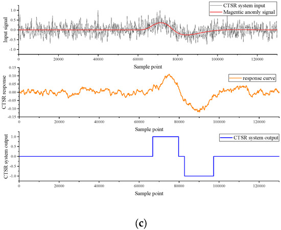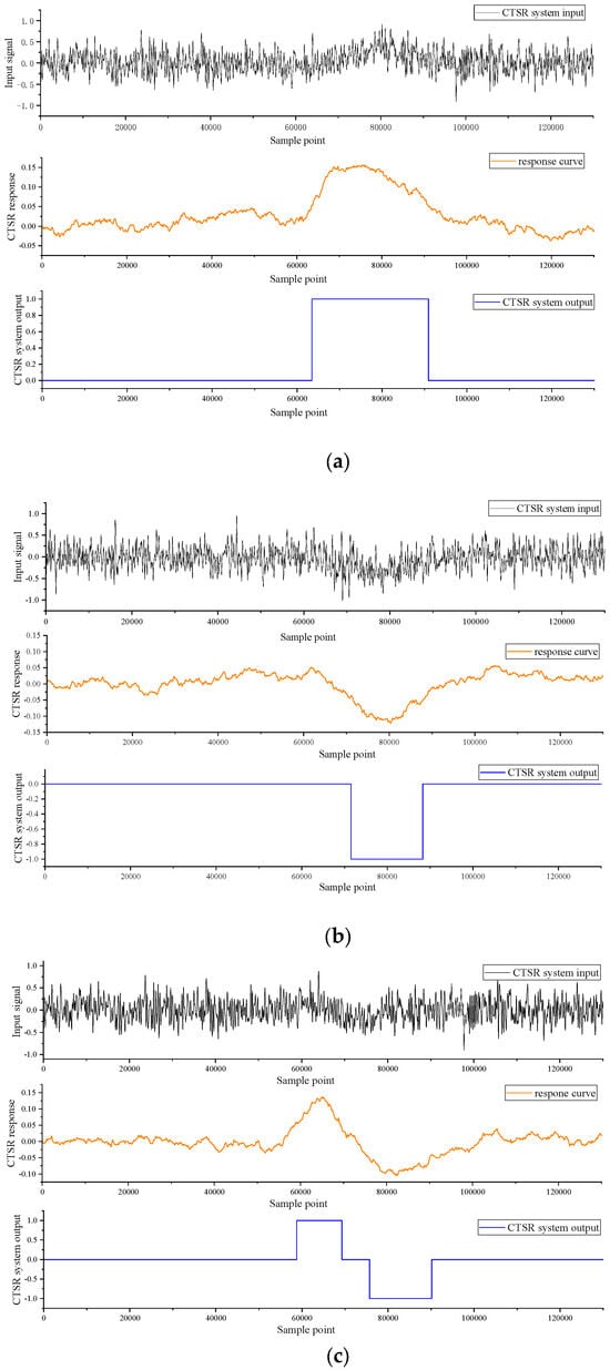 The CTSR system response to two synthetic input signals is shown in Figure 14, (SNR = −5.5 dB), where (a) is the mixed signal of the magnetic anomaly of the sensor moving along a 30° angle with the simulated geomagnetic noise, the response output of the composite tri-stable stochastic resonance detection peak signal, and the verdict signal of the CTSR system; (b) is the mixed signal of the sensor where the magnetic anomaly moves along the 200° direction with the simulated geomagnetic noise, the response output of the composite tri-stable stochastic resonance detection trough signal, and the judgment signal of the CTSR system; and (c) is the mixed signal of the sensor moving magnetic anomaly along the 300° direction with the simulated geomagnetic noise, the response output of the composite tri-stable stochastic resonance detection peak and trough signal, and the judgment signal of the CTSR system.