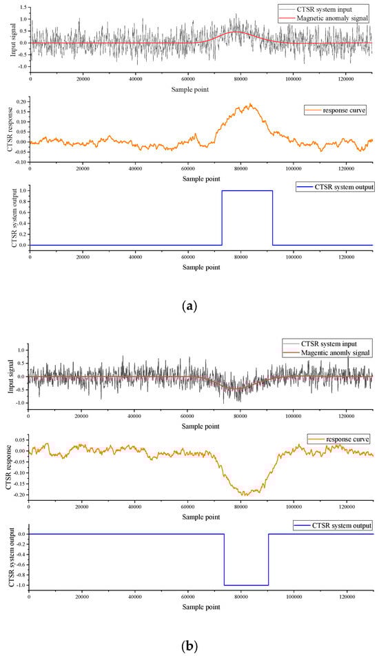 In Figure 12, the typical magnetic anomaly signal obtained from the output of the TMR sensor is combined with the real geomagnetic field noise as the input to the CTSR system. The system parameters, namely a = 0.05, b = 0.2, and c = 0.35, were optimized using QGA and SNR metrics. For more detailed information, please refer to Section 3.2.