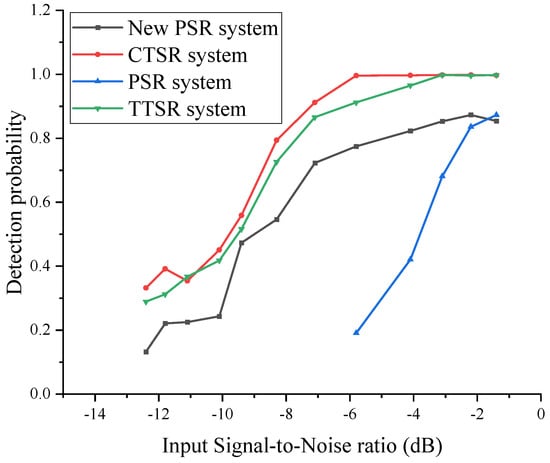 The CTSR and new PSR systems basically maintain a stable, high monitoring probability at SNRs greater than −6 dB, and the detection probabilities of both detection systems decline significantly at SNRs less than −6 dB. When the input SNR is −1 dB, the detection effect of the PSR detection system is similar to that of the new PSR detection system. When the input SNR is between −1 and −6 dB, the monitoring probability of the PSR detection system drops sharply. The CTSR detection system performs significantly better than the new PSR and other detection systems, and the detection probability is close to 100% at SNRs less than −6 dB. CTSR offers the advantage of independently adjusting the depth and width of the potential well compared to TTSR. Therefore, it is evident from Figure 15 and Table 2 that CTSR exhibits a more pronounced effect of stochastic resonance under low SNR conditions.