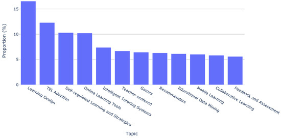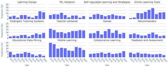 Moreover, we can see the topic distributions across the last ten years of the conference in Figure 3. This visualization illustrates that the most recurrent topics were “Learning Design”, “TEL Adoption”, and “Self-regulated Learning and Strategies”, as opposed to “Collaborative Learning” and “Feedback and Assessment”, which were not so popular.