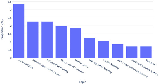 As previously indicated in Section 2, earlier research has explored topic trends within this domain. For instance, in their study, Chen et al. [22] employed LDA topic finding using paper abstracts to discover trends. Several of their identified topics, such as “Collaborative learning” and “Feedback”, align with our findings. However, they also highlighted topic less common today, such as ”Blended learning”. Likewise, Hung [23] conducted an investigation on e-learning trends from 2000 to 2008. Employing text mining, they clustered documents based on abstract similarities and presented these clusters in a hierarchical tree structure. This study revealed some more specific trends such as “Architecture and standards”, “Simulations”, and “E-learning applications in medical education and training”. Our research also aligns with some of these trends. For instance, the trend labeled “community and interactions” corresponds with our topic “Collaborative learning”. The emergence of novel trends like “dashboards” is promising, offering the potential to extract more nuanced insights from existing data, presenting a contemporary challenge to address.