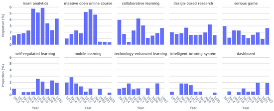 Analogously, in Figure 6, we observe the temporal evolution of keyword distributions. We observe that some keywords, such as “design-based research”, reappear year after year, with a consistently stable distribution over the last decade. Furthermore, we note other keywords that have experienced a substantial surge in frequency. This is the case for “learn analytics”, increasing from 1.49% in 2013 to a peak of 5.88% in 2019. Similarly, “massive open online course” increased from 0.99% in 2013 to a maximum of 5.67% in 2018. What we discover looking at Figure 6 is that the majority of keywords registered a decline in frequency from 2020 to 2022. This shift could potentially signify emerging trends in 2022 or a greater diversity of paper topics during this period.