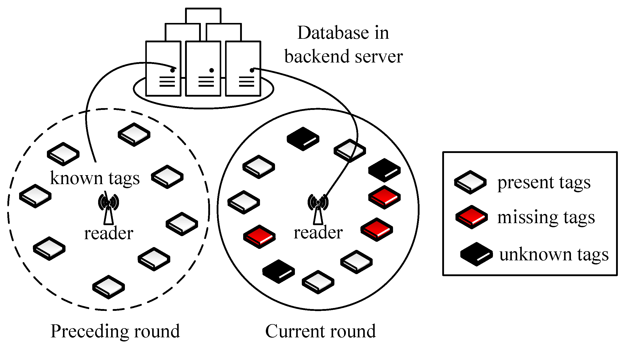 - Zhang, Y.; Chen, S.; Zhou, Y.; Fang, Y. Missing-Tag Detection with Unknown Tags. IEEE/ACM Trans. Netw. 2020, 28, 1297–1310. [Google Scholar] [CrossRef]