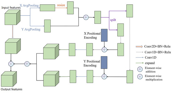 Subsequent to the pooling of spatial dimensions, the resultant feature map matrix , encompassing amalgamated meticulous positional information, undergoes partitioning into two distinct matrices: and . This division is conducted to enable the integration of supplementary positional encoding information into the feature matrix across both spatial orientations.