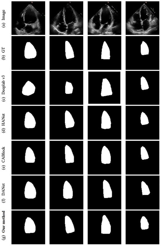 Visual results of comparative experiments with other advanced methods on the EchoNet-Dynamic dataset.