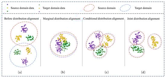 Effects of different distribution alignments. (a) Presents the data distribution of the source and target domains prior to distribution alignment. Meanwhile, (b), (c), and (d), respectively, illustrate the effects of marginal distribution alignment, conditional distribution alignment, and joint distribution alignment.
