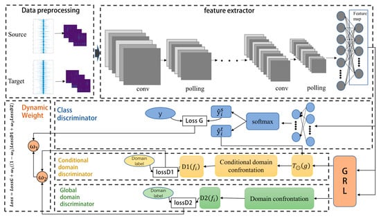 As shown in Figure 2, the DCAA model consists of feature extractor, classifier, domain discriminator, and conditional domain discriminator. The feature extractor F is responsible for extracting domain-invariant features from the source domain and target domain data, encoding them into feature vectors . Classifier C is able to perform fault classification utilizing feature vectors. The domain discriminator D1 and conditional domain discriminator D2 are used to align the marginal distribution and conditional distribution, respectively. Additionally, dynamic weighting factors ω1 and ω2 are introduced to adjust the model training process, enhancing the model’s generalization capability and robustness.