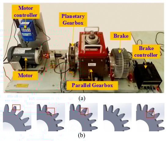 The Southeast University gearbox fault test rig. (a) displays the structure of the gearbox test rig, (b) shows five different types of gear faults.