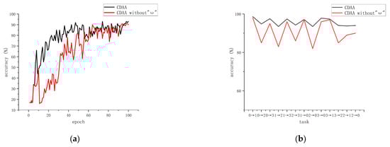 To demonstrate the impact of dynamic weighting factors on the model, we conducted ablation experiments using Experiment 2 as an example. The experimental results are shown in Figure 5. In Figure 5a represents the iteration graph for Task 1 ~ 0, and (b) shows the accuracy of the two methods in each transfer task. It is evident that, during the training process, CDAA with the addition of dynamic weighting factors converges faster and is more stable. Moreover, it performs well in complex transfer tasks and exhibits stronger robustness.