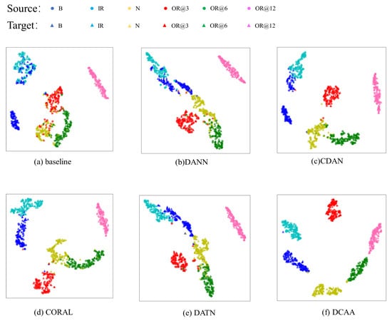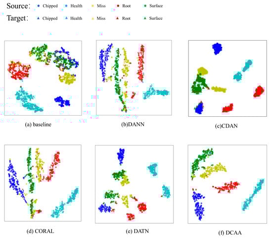 From Figure 6a and Figure 7a, it is evident that in the CNN without the domain adaptation module, the same-class feature distributions from different domains are relatively distant. Furthermore, in the target domain, the overlapping of distributions among some classes hinders effective distinction, resulting in lower accuracy in the target domain. DANN and CORAL are capable of reducing the feature distribution distance between the two domains effectively. However, due to their focus only on aligning the marginal feature distributions, the alignment of some specific class features is not prominent, leading to potential confusion between classes. DATN and CDAA perform conditional distribution alignment for both the source and target domain features, which prevents the feature distance between different fault types from being compressed. As a result, they are more effective in fault classification compared to DANN and CORAL, as they avoid confusion between different classes. CDAA, with the addition of dynamic weight factors, combines both marginal and conditional distribution alignment, effectively reducing the distance between domains and avoiding feature confusion between classes. Figure 6f and Figure 7f clearly demonstrate that DCAA effectively clusters the same-class data from both domains. Moreover, in the target domain, there is strong intra-class compactness and inter-class separability, facilitating the generation of decision boundaries. Therefore, CDAA achieves higher accuracy compared to the first two models.