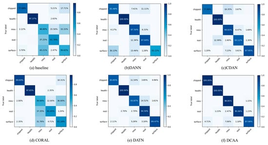 From the confusion matrices, it can be observed that in Experiment 1, the miss, root, and surface fault categories have significant differences in feature distributions. DANN and CORAL, which only perform marginal distribution alignment, struggle to accurately discriminate these three fault categories. The conditional distribution alignment methods can effectively improve this situation, but the accuracy is still influenced by the fault types. CDAA, proposed in this study, adjusts the alignment of both distributions using dynamic weight factors, aiming to minimize the feature distribution distance among the same fault categories. As a result, CDAA performs well in complex fault classification tasks. The same conclusion can be drawn from Experiment 2, demonstrating the robustness of CDAA in different conditions.