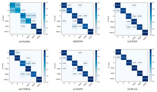The experimental results are shown in Table 2. The baseline, which did not undergo transfer training, achieved an average accuracy of only 67.22% on the target domain. In comparison, DANN, CDAN, CORAL, DATN, and CDAA achieved average accuracies of 80.79%, 82.74%, 71.19%, 87.14%, and 92.56%, respectively.