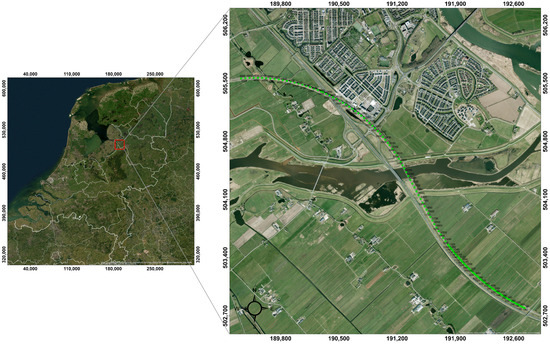 The Hanzelijn corridor is localized west of Zwolle in the province of Overijsel in the Netherlands (Figure 1). The projection of the dark fiber-optic cable alongside the railroad line is indicated by green dots. The geology of the Netherlands consists mainly of sedimentary deposits from the Cratonian to the Quaternary. Pleistocene sand deposits and Holocene marine and fluvial deposits dominate. For the Hanzelijn corridor, the lithological composition and genesis of this part of the subsurface relevant for geotechnical constructions are presented here from old to young [17]. The Pleistocene deposits mainly consist of sand originating from a former Rhine system, cover sands formed in the latest ice age, and/or small-scale stream deposits. During the Holocene, with higher sea levels and, thus, higher groundwater levels, peat could grow on top of these sandy formations, alternating with clay deposits.