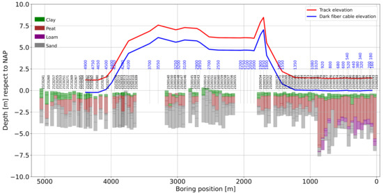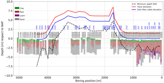 In Figure 2, the lithology cross-section along the survey line is plotted together with the selected dark fiber-optic segments, indicated by blue-colored numbers (the numbers correspond to the first channel of the selected 100-channel fiber segments). The elevation of the fiber-optic cable (blue line) with respect to the track position (red line) is also indicated. Notice that the fiber-optic cables are buried about 0.6 m from the free surface. All elevations are relative to the NAP (Normaal Amsterdams Peil) reference, which is the reference elevation for the Netherlands.