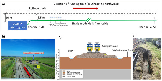 The dark fiber cable is packed in an HDPE (High-Density Polyethylene) pipe alongside the railway track (Figure 3d). It is important to notice that the HDPE pipe that contains the fiber appears to be very well coupled to the ground, which enhances the quality of the recorded signals.