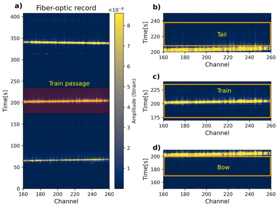 (a) Example of a dark fiber-optic record that contains 3 train passages of 100 signals (between channels 160 and 260). The plot also highlights the (b) tail, (c) train, and (d) bow wave signals utilized for later processing.