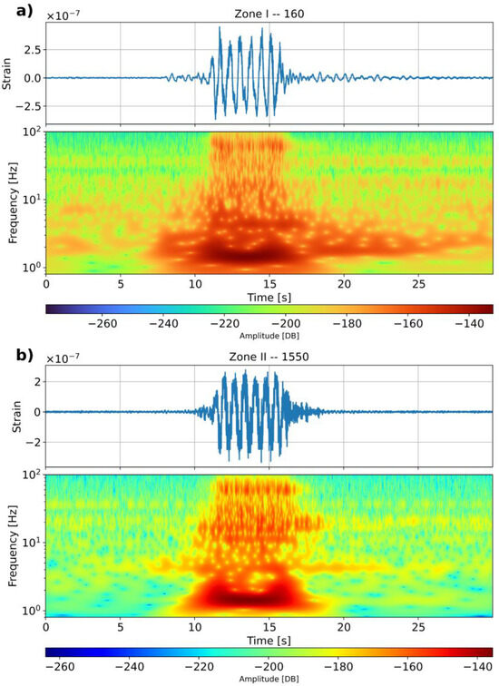A first inspection of the recorded dark fiber data is made by characterizing the frequency response of the transient signals recorded at two selected locations within Zone I and Zone II.
