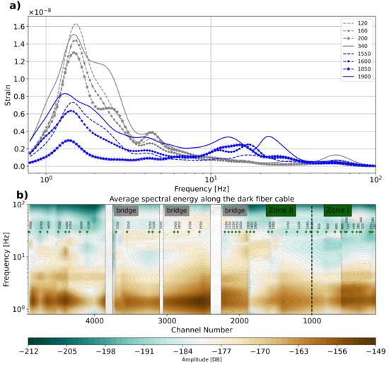 (a) Average spectrum for selected traces at positions in Zone I (120, 160, 200, and 340) and Zone II (1550, 1600, 1850, and 1900) and (b) energy distribution after interpolating individual average curves (frequency with respect to channel number). We also indicate the position of bridges along the fiber-optic line.